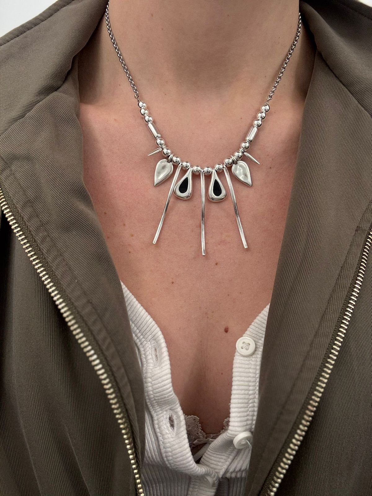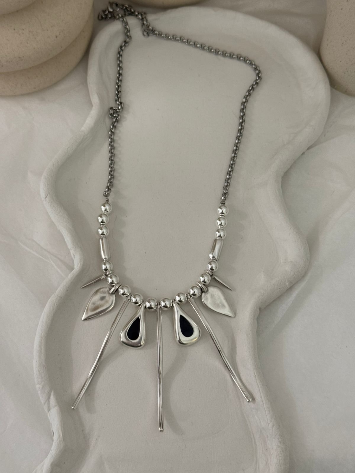 Αλυσίδα με μεταλλικές χάντρες αγκαλιάζει το λαιμό και καταλήγει σε μια σύνθεση από κρεμαστά στοιχεία: γυαλιστερές σταγόνες, μαύρες λεπτομέρειες και λεπτές ράβδους που δημιουργούν κίνηση και φως σε κάθε βήμα. Το αποτέλεσμα είναι ένα σύγχρονο, edgy κόσμημα που τραβά τα βλέμματα χωρίς να χάνει τη διακριτική του φινέτσα.