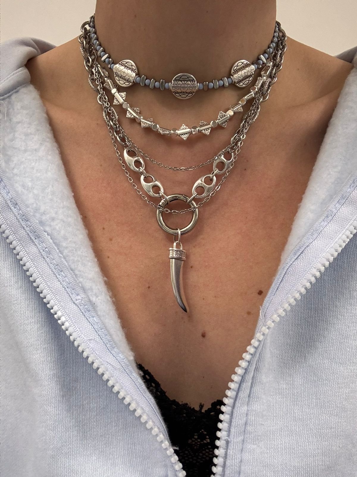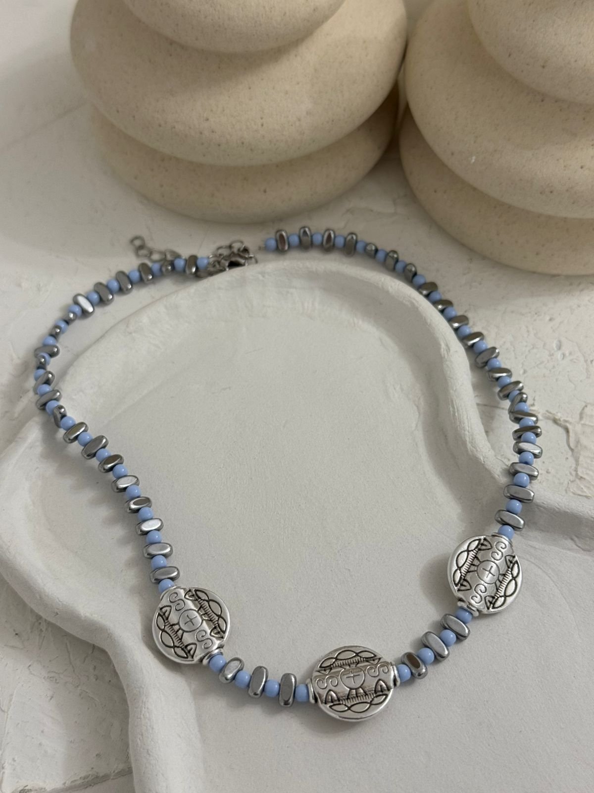 Κομψό και διαχρονικό κολιέ που συνδυάζει αρμονικά minimal αισθητική με ιδιαίτερες λεπτομέρειες. Αποτελείται από μικρές χάντρες σε απαλό γαλάζιο τόνο, διακοσμημένες με μεταλλικά στοιχεία σε ασημί απόχρωση, ενώ τρία διακριτικά στρογγυλά charms με ανάγλυφα μοτίβα προσθέτουν χαρακτήρα και μοναδικότητα.