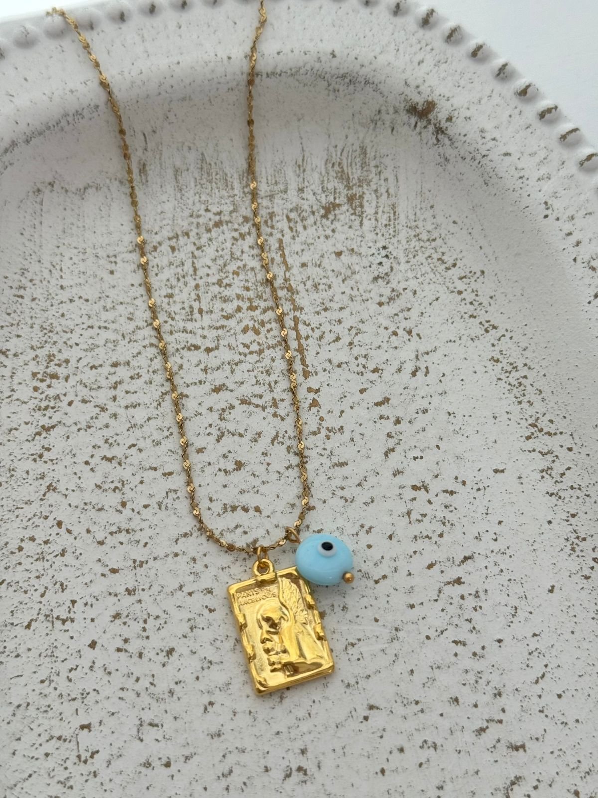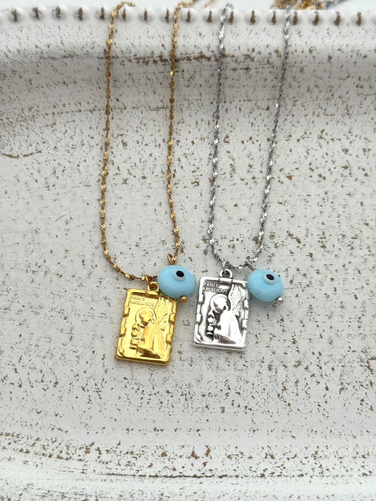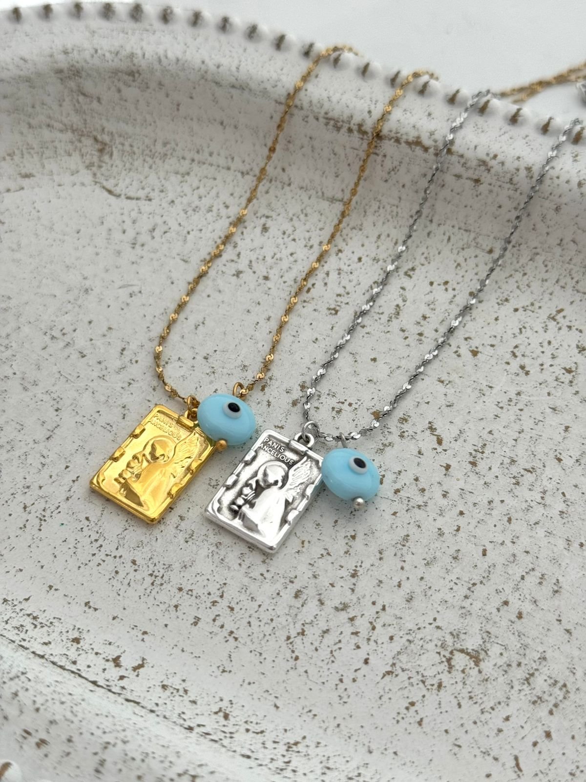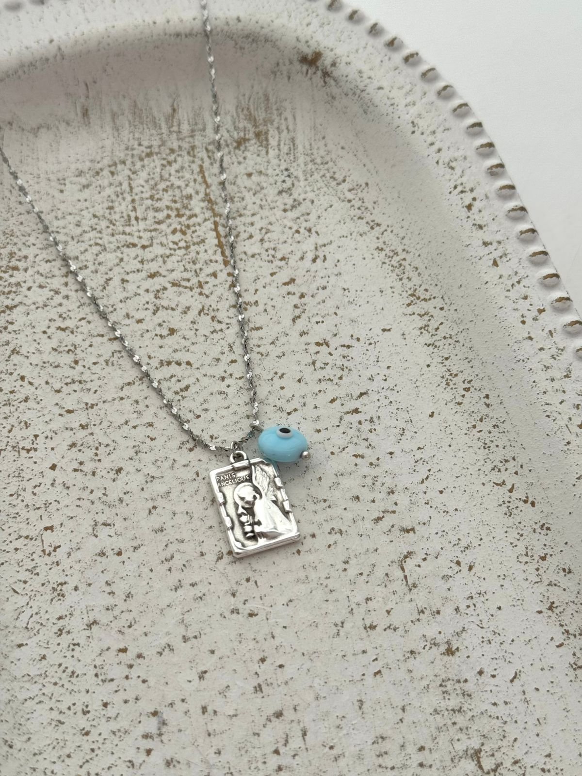 Κολιέ με ατσάλινη αλυσίδα, ορείχαλκινο επιχρυσωμενο 24Κ/ επαργυρωμένο 925 στοιχείο και γυάλινη χάντρα.