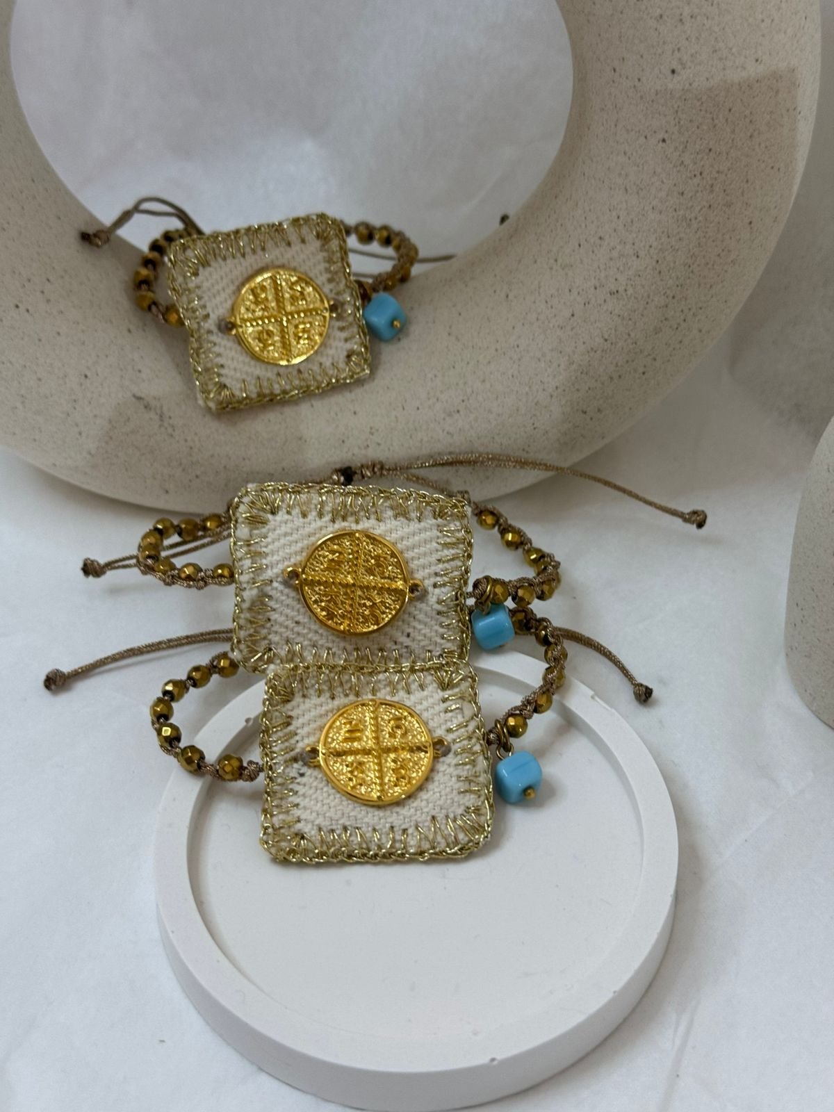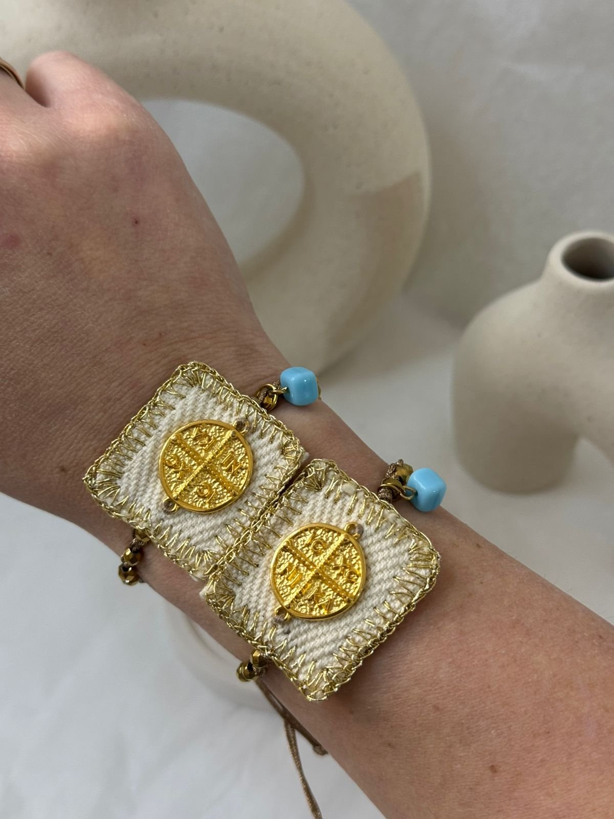 Χειροποίητο βραχιόλι φυλαχτό με κωνσταντινάτο και τυρκουάζ χάντρα, σύμβολο προστασίας, δύναμης και καλοτυχίας. Το κωνσταντινάτο, με τον διαχρονικό του χαρακτήρα, συνδυάζεται αρμονικά με την τυρκουάζ χάντρα, γνωστή για τις ιδιότητές της να φέρνει ηρεμία και θετική ενέργεια. Ένα ιδιαίτερο κόσμημα με διακριτική πολυτέλεια, ιδανικό για καθημερινή χρήση ή ως ένα ξεχωριστό δώρο με βαθύ συμβολισμό.