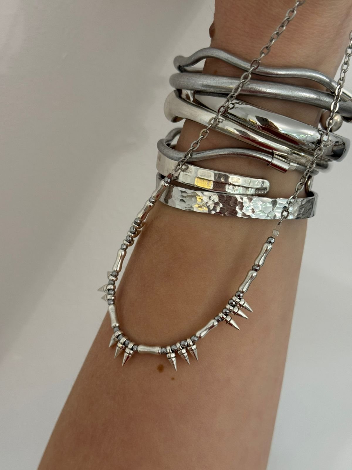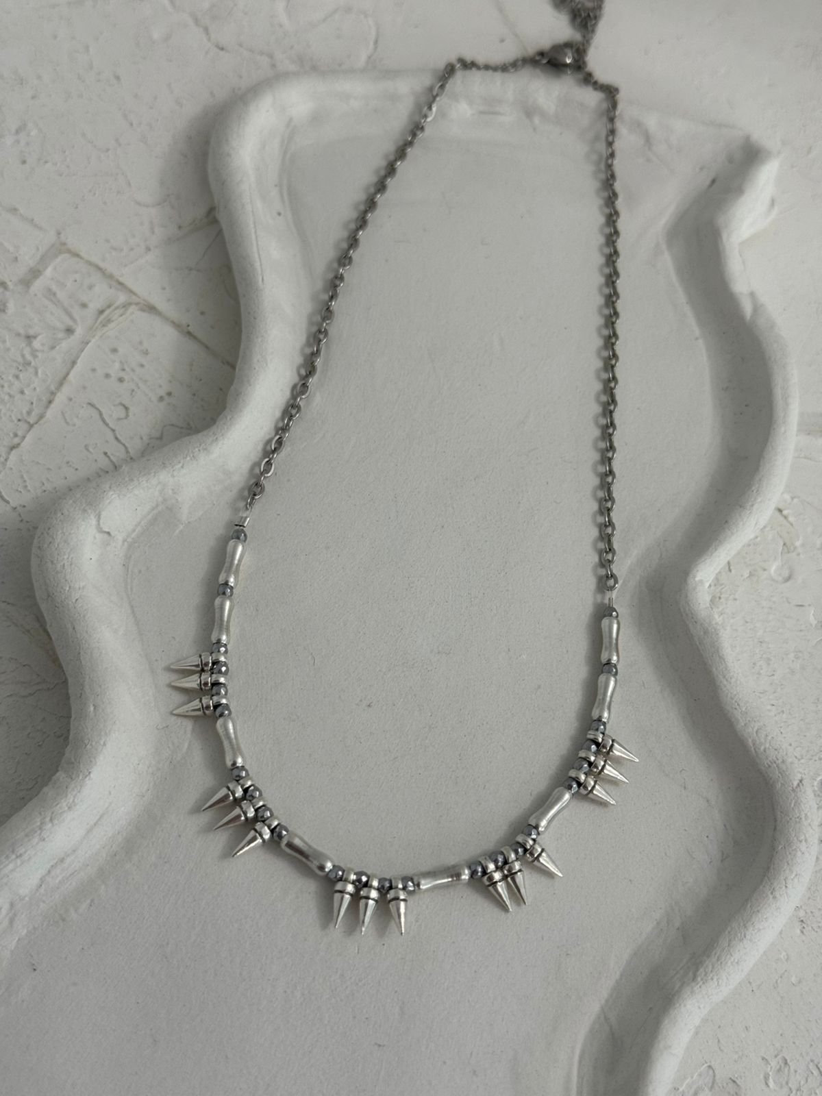 Κολιέ με δυναμικό χαρακτήρα και σύγχρονη αισθητική. Αποτελείται από λεπτή αλυσίδα σε ασημί τόνο και διακοσμείται με μεταλλικές χάντρες και διακριτικά spikes που προσθέτουν edgy πινελιά χωρίς να χάνουν την κομψότητά τους. Ιδανικό για layering αλλά και για να φορεθεί μόνο του ως statement piece, αναδεικνύει κάθε outfit — από minimal καθημερινά looks μέχρι πιο βραδινές εμφανίσεις.