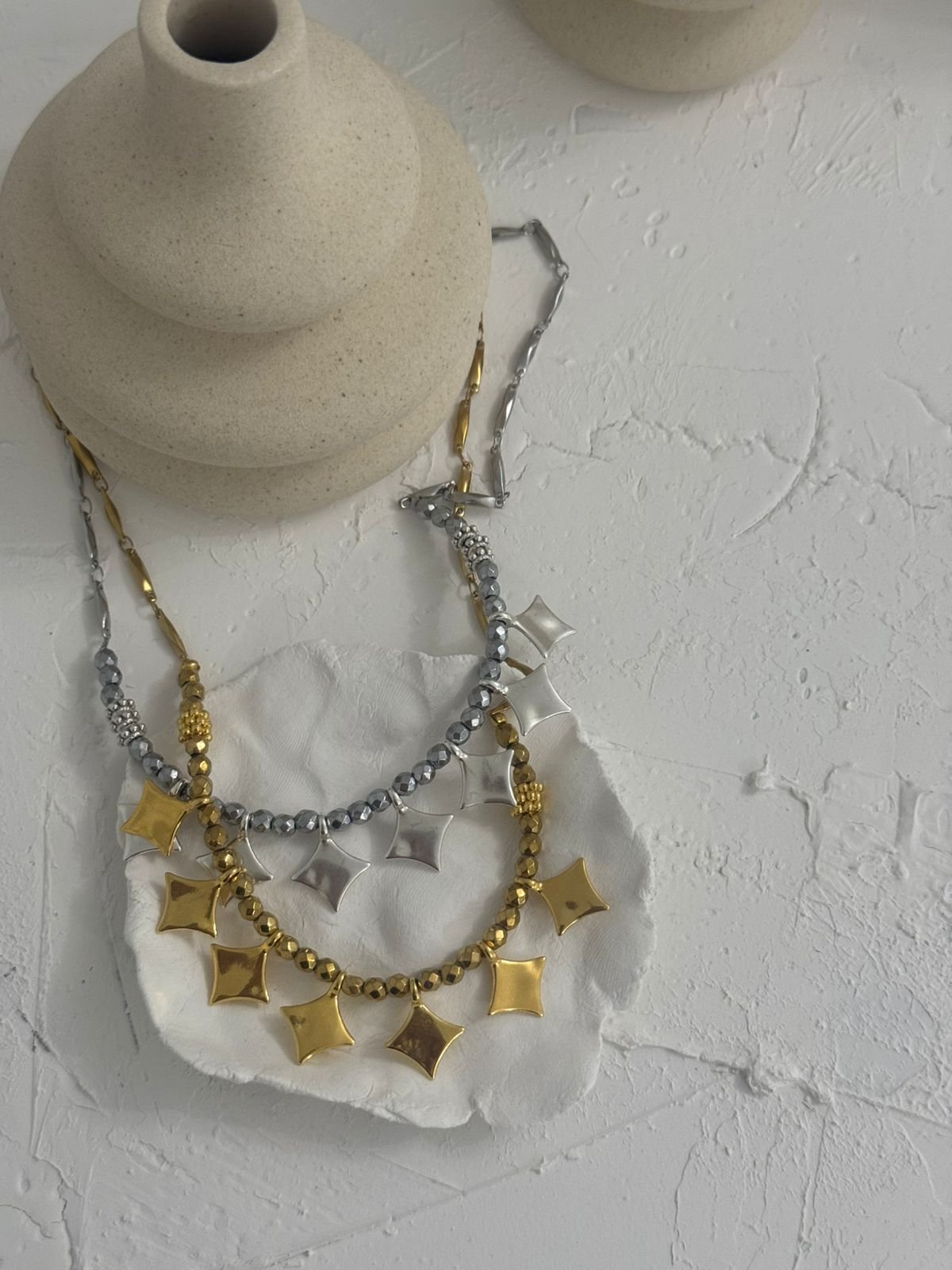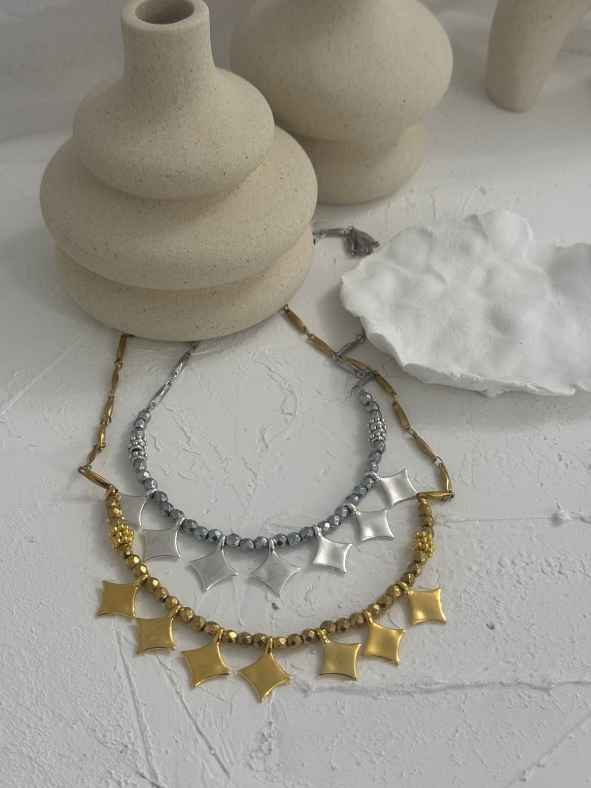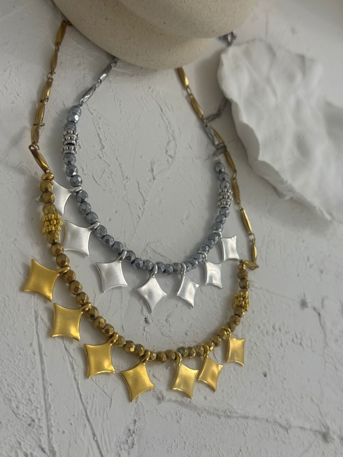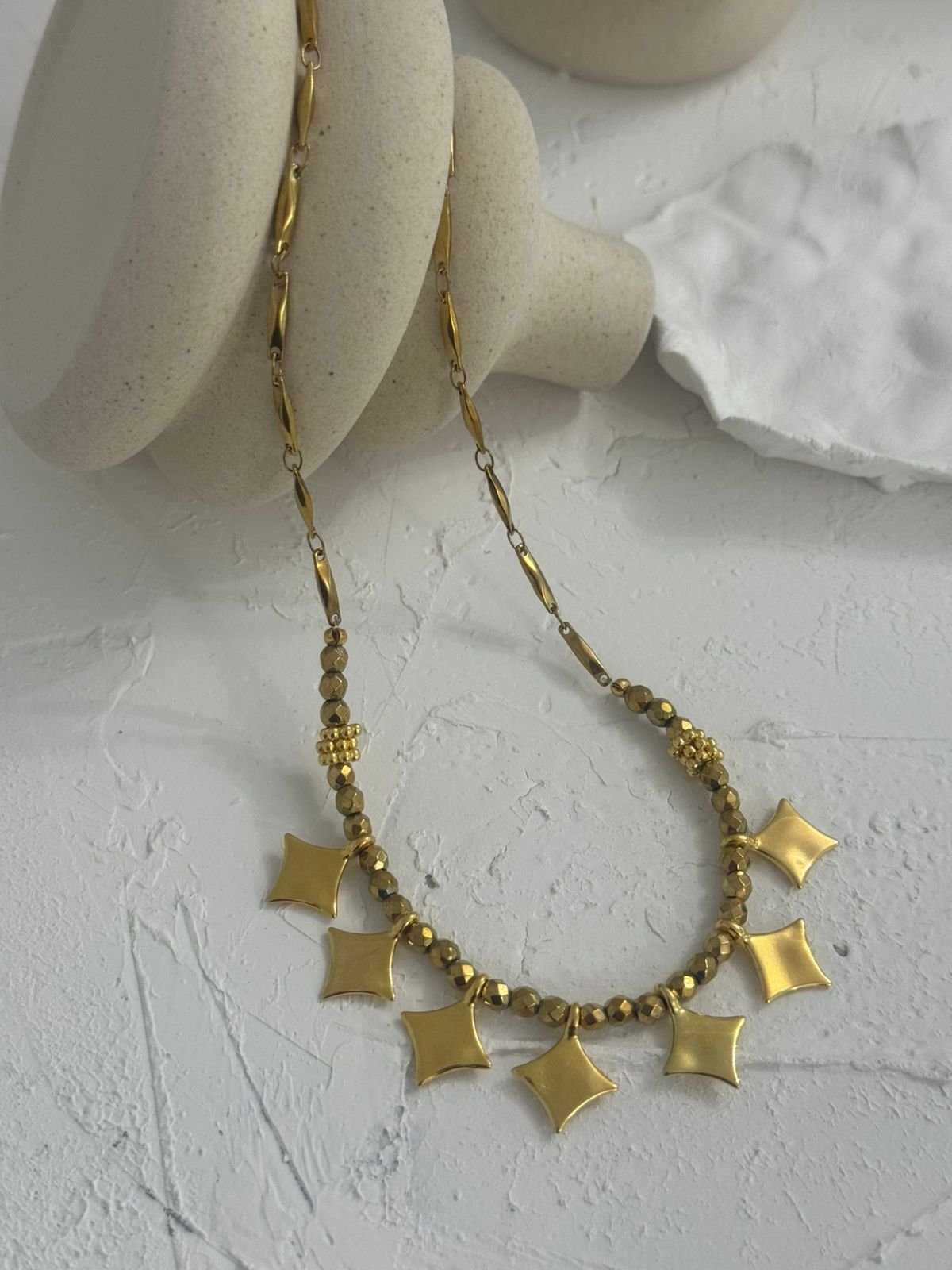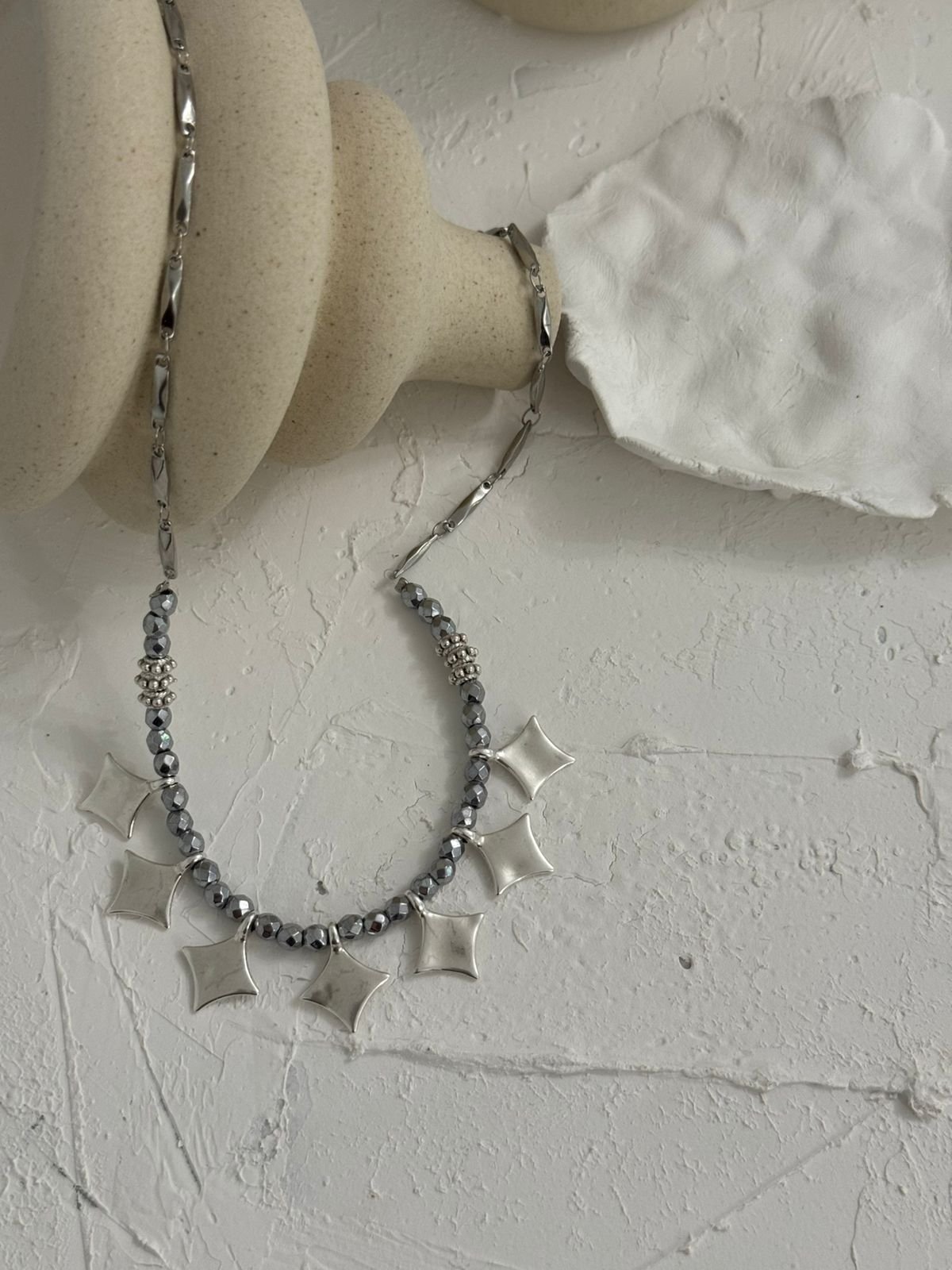 «Ένα εντυπωσιακό κολιέ που συνδυάζει την κομψότητα του αιματίτη με τη μοντέρνα αλυσίδα, στολισμένη με λαμπερά charms σε σχήμα αστεριών. Ένα κόσμημα που απογειώνει κάθε εμφάνιση, προσθέτοντας μυστήριο και λάμψη σαν νυχτερινός ουρανός.»