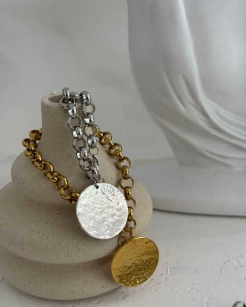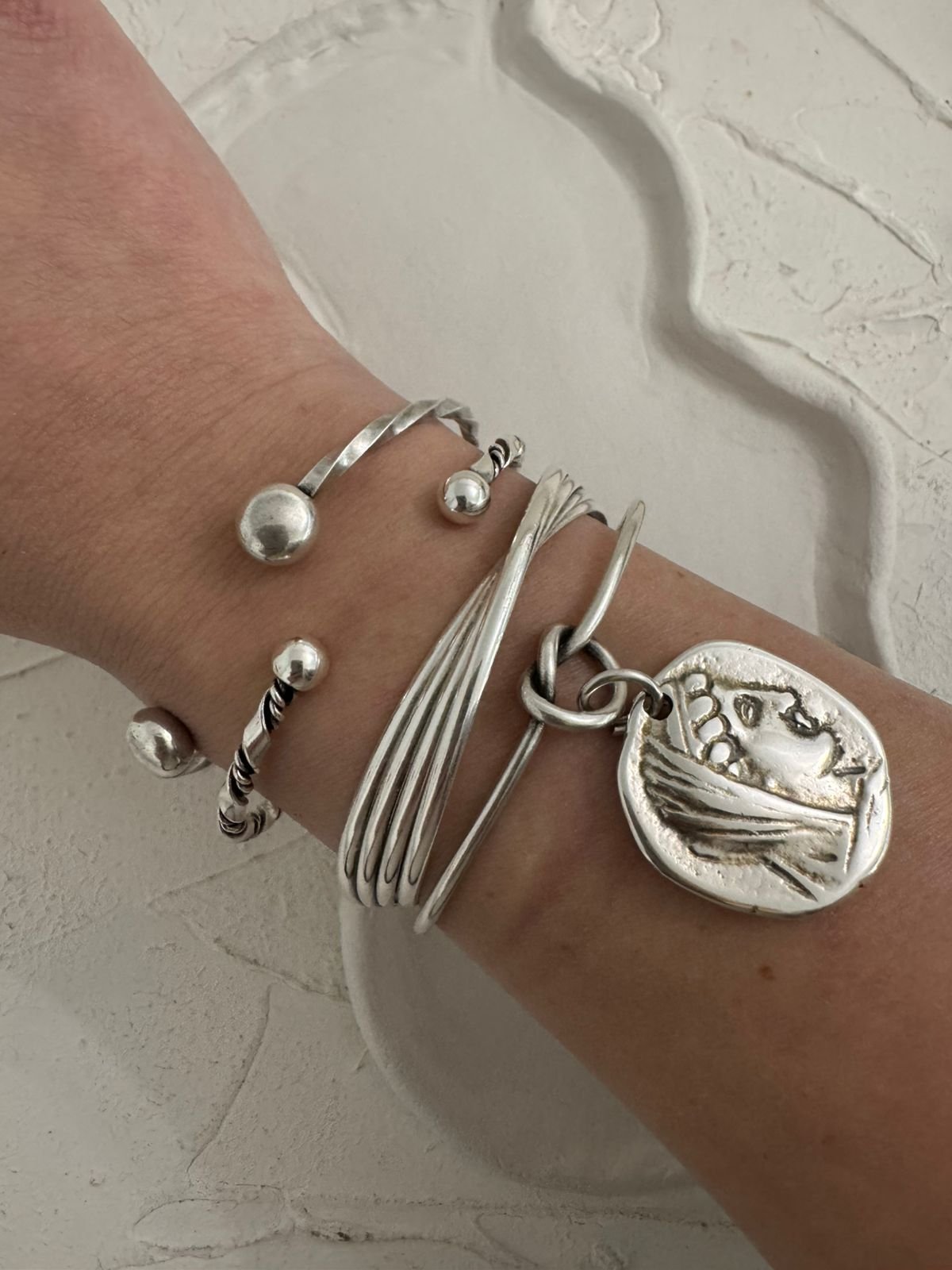 Λεπτεπίλεπτη βέργα με διακριτικό σύμβολο κόμπου, που εκφράζει τη σύνδεση, τη δύναμη και τη συνέχεια. Στο κέντρο της κρέμεται μια εντυπωσιακή λύρα διπλής όψης, προσφέροντας δύο διαφορετικές εκφράσεις σε ένα κόσμημα. Ένα κομμάτι με συμβολισμό και χαρακτήρα, που φοριέται καθημερινά αλλά ξεχωρίζει σε κάθε εμφάνιση.
