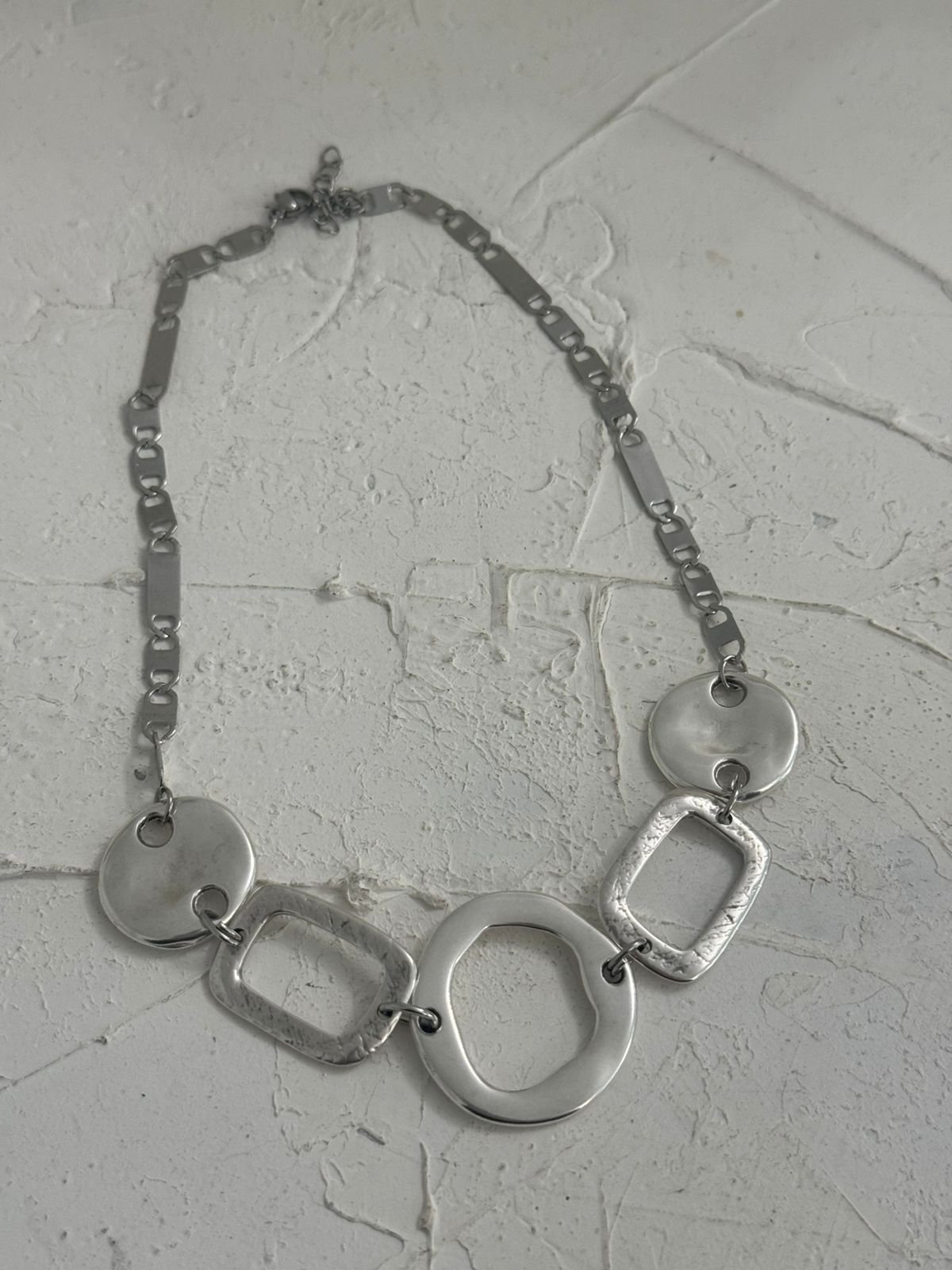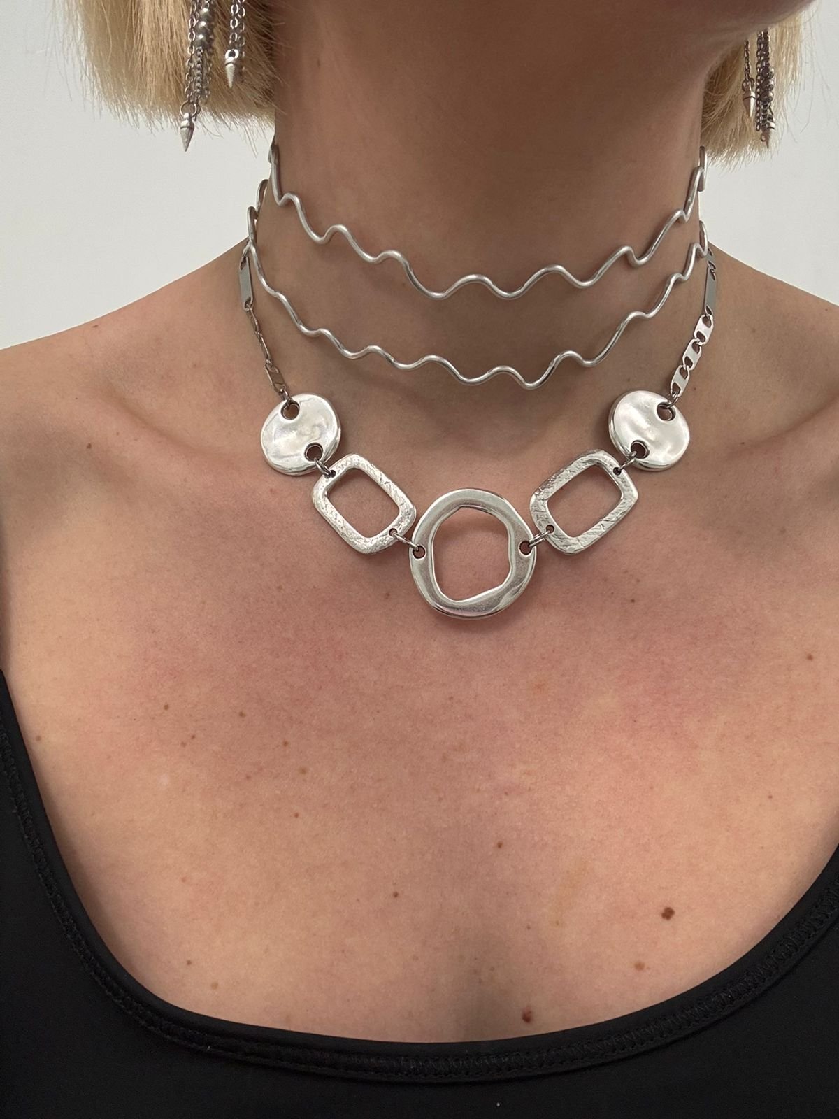 Ένα εντυπωσιακό κολιέ που ισορροπεί ανάμεσα στη σύγχρονη αισθητική και τη διαχρονική κομψότητα. Τα γεωμετρικά του σχήματα συνδυάζονται αρμονικά, δημιουργώντας ένα παιχνίδι συμμετρίας και κίνησης που τραβά το βλέμμα. Καθαρές γραμμές και μίνιμαλ σχεδιασμός αναδεικνύουν τη δύναμη της απλότητας, ενώ η σύνθεσή του αποπνέει δυναμισμό και αυτοπεποίθηση. Ένα κόσμημα που μπορεί να φορεθεί από το πρωί έως το βράδυ, προσθέτοντας μια μοντέρνα πινελιά σε κάθε εμφάνιση.